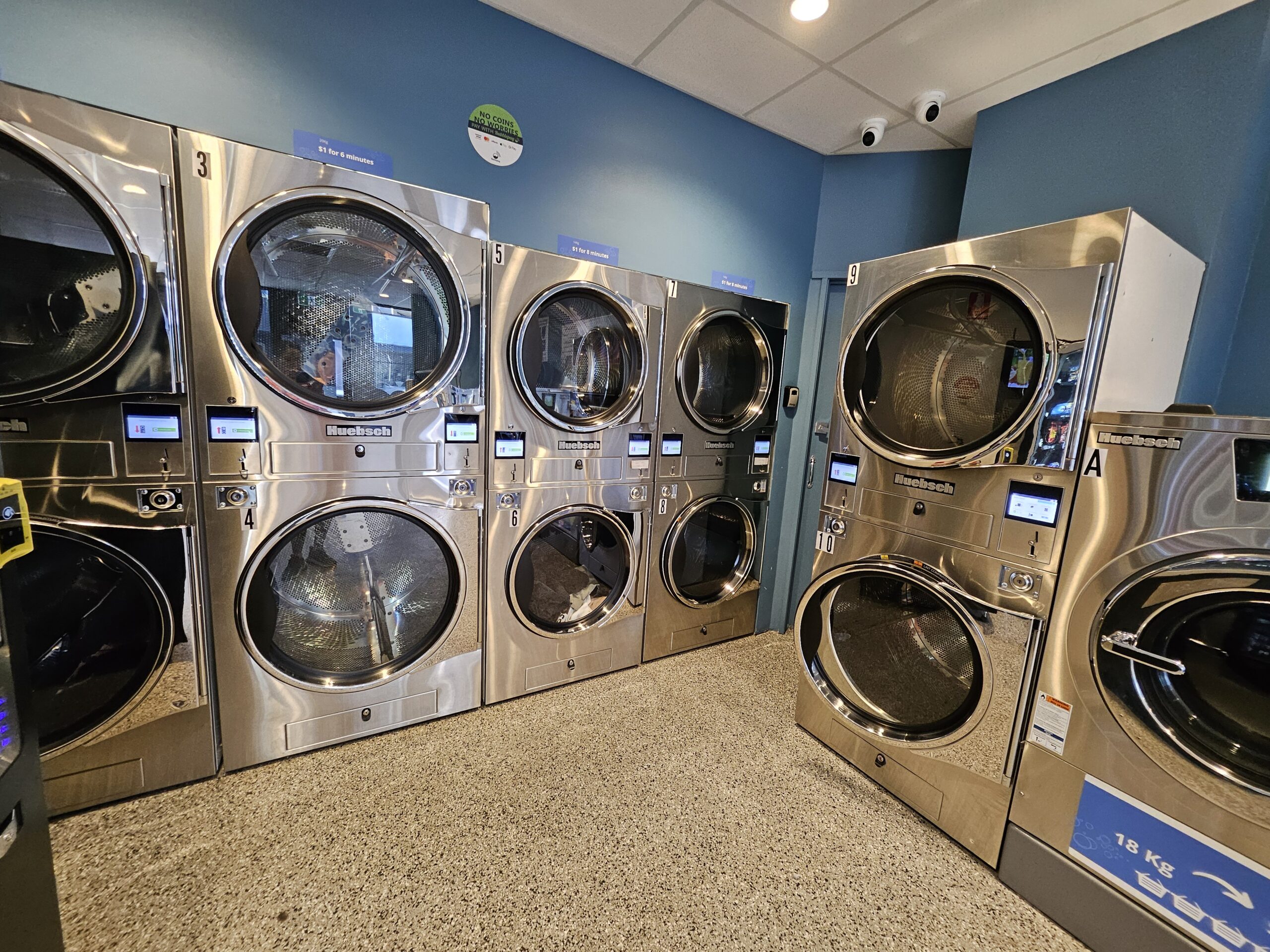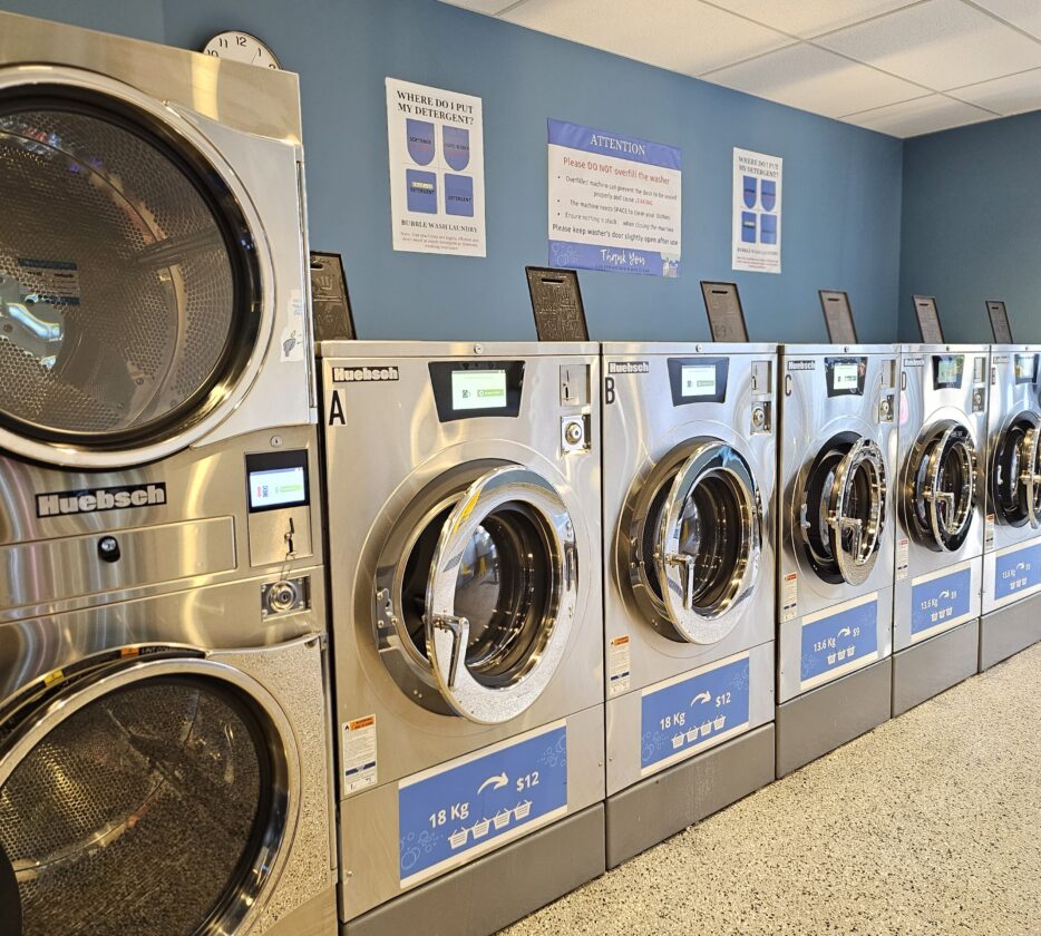 We have 6 top of the line large Huebsch Industrial Washing Machines that can do up to a massive 18KG wash load! As well as 10 Huebsch Industrial Dryers to ensure you are never waiting long.